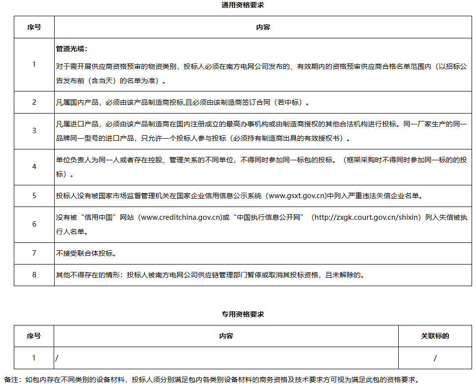 2.2招标范围:广东电网公司2025年管道光缆框架招标,本次招标含管道光缆共1个物资品类。本次招标适用于广东电网有限责任公司(不含广州供电局)的所有项目,前述项目包含但不限于所招物资对应的电压等级,投标人若中标必须根据实际需要无条件供货,不得再提出异议。