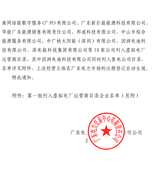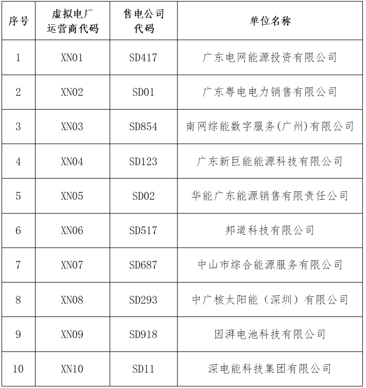 9月19日,广东电力交易中心公布了第一批虚拟电厂运营商名录,共有10家企业列入,广东电网能源投资有限公司、广东粤电电力销售有限公司、南网综能数字服务(广州)有限公司、广东新巨能能源科技有限公司、华能广东能源销售有限责任公司、邦道科技有限公司、中山市综合能源服务有限公司、中广核太阳能(深圳)有限公司、因湃电池科技有限公司、深电能科技集团有限公司。