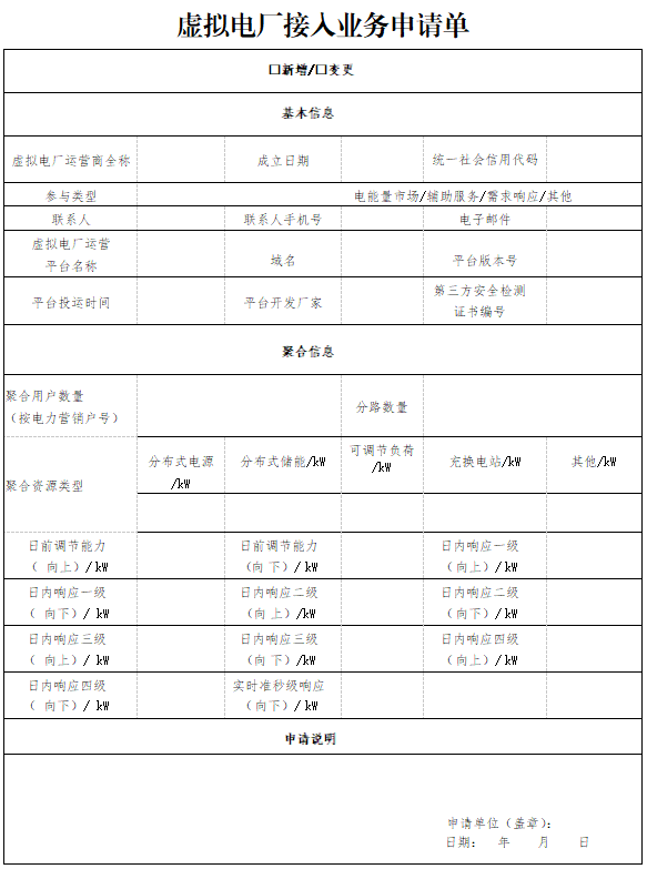 2.调节能力变更。虚拟电厂因新增、减少聚合资源用户或调节容量、调节速率、响应时间等指标发生重大变化时,应向省负荷管理中心申请调节能力变更,由省负荷管理中心组织开展变更校核,出具能力校核报告并更新《虚拟电厂调节能力核验凭证》,变更信息同步至相关运营机构。虚拟电厂运营商应保持聚合资源相对稳定,资源变更周期应不少于3个月。
