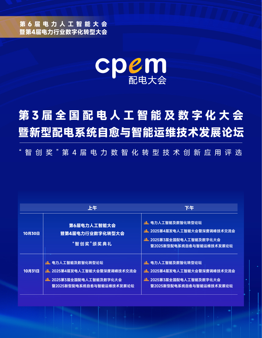 2025年10月30-31日,“第6届电力人工智能大会暨第4届电力行业数字化转型大会”将在山东省青岛市盛大召开!同期举办2025年度“第3届全国配电人工智能及数字化大会暨新型配电系统自愈与智能运维技术发展论坛”、“电力人工智能及数智化转型论坛”以及“第4届发电人工智能大会暨深度调峰技术交流会”。