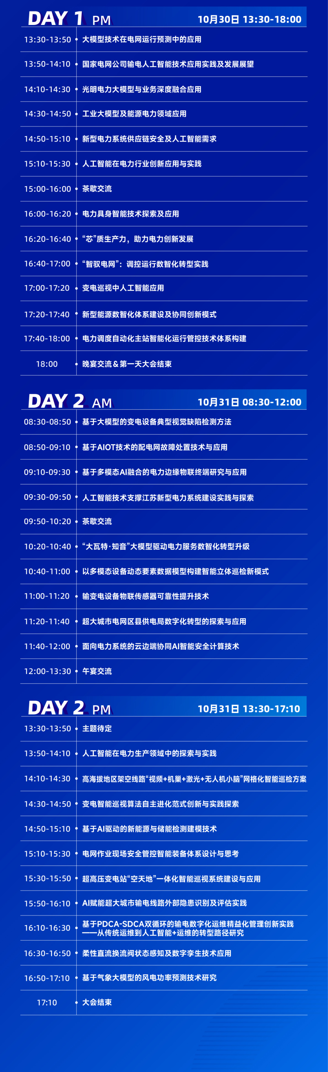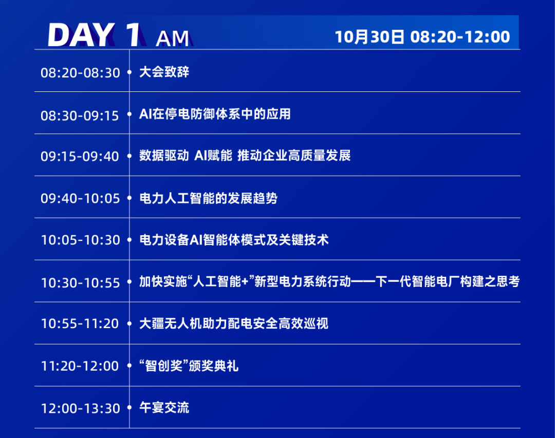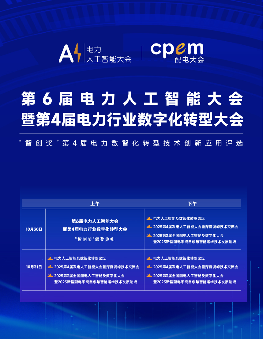 2025年10月30-31日,“第6届电力人工智能大会暨第4届电力行业数字化转型大会”将在山东省青岛市盛大召开!同期举办2025年度“电力人工智能及数智化转型论坛”、“第3届全国配电人工智能及数字化大会暨新型配电系统自愈与智能运维技术发展论坛”以及“第4届发电人工智能大会暨深度调峰技术交流会”。