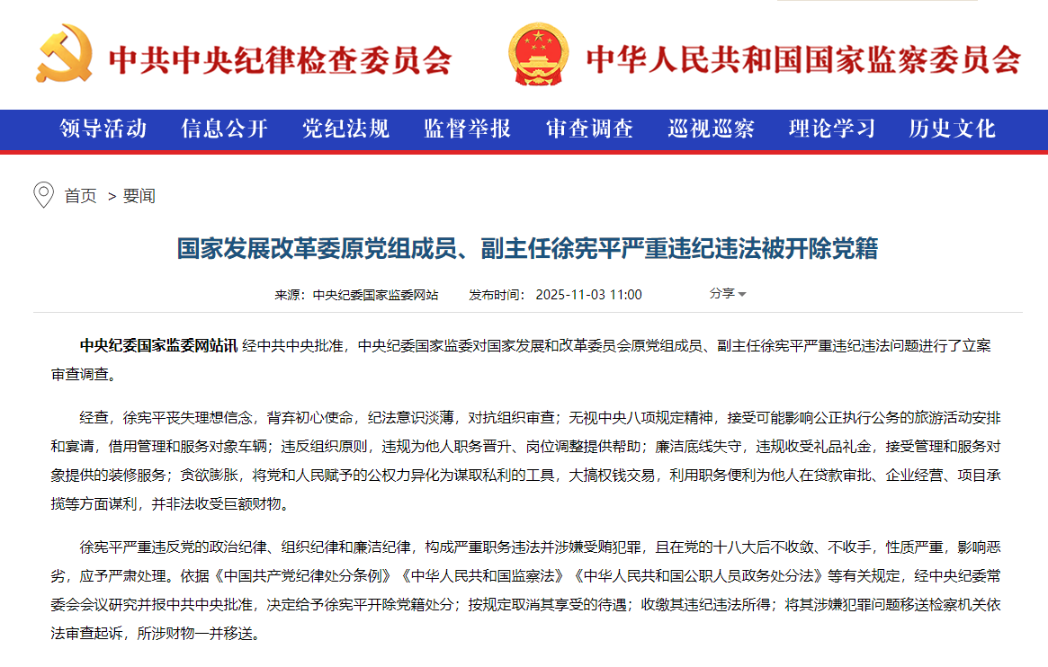 中央纪委国家监委网站11月3日消息,经中共中央批准,中央纪委国家监委对国家发展和改革委员会原党组成员、副主任徐宪平严重违纪违法问题进行了立案审查调查。