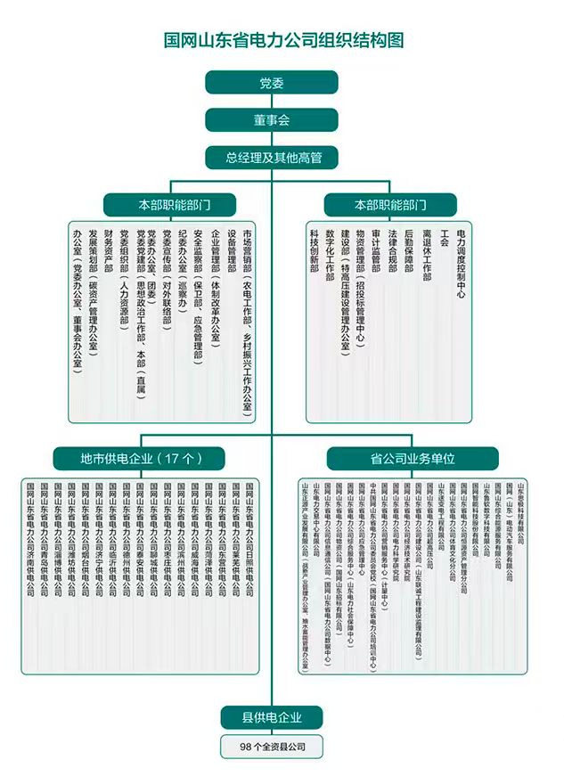 山东电网除职能部门(如党委组织部、宣传部、办公室等),主要包括各地市供电公司,如济南、青岛供电公司及其县公司和省公司业务单位、电科院,信通公司,党校等。