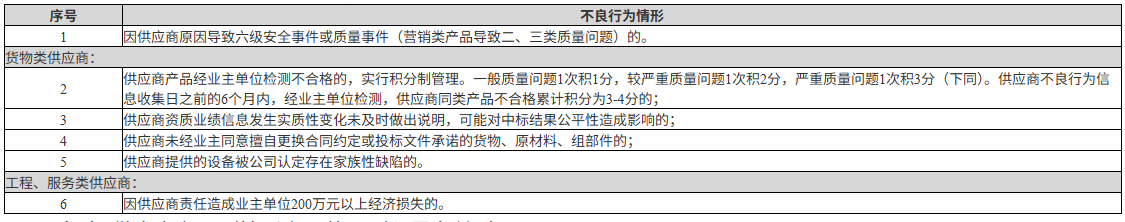各单位实施招标采购范围的供应商不良行为,在总部供应商不良行为处理信息公示之前6个月内(以各单位供应商不良行为处理公布日期为准),供应商被任何1家单位列入黑名单的,或同一供应商同类产品因质量问题被2家及以上单位暂停中标资格,由总部做出扩大处理决定,并在公司系统内执行。各单位自行制订抽检规范的产品,因抽检质量问题被暂停中标资格的,总部不做扩大处理。