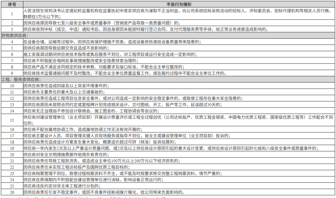 为进一步促进供应商诚实守信、保证质量,国家电网有限公司对《国家电网有限公司供应商不良行为处理管理细则》进行了修订,统一合并入《国家电网有限公司供应商关系管理办法》。新版办法对部分不良行为情形进行了修订,增加了结果应用时间节点等内容。新修订的《办法》自2023年11月10日起施行。