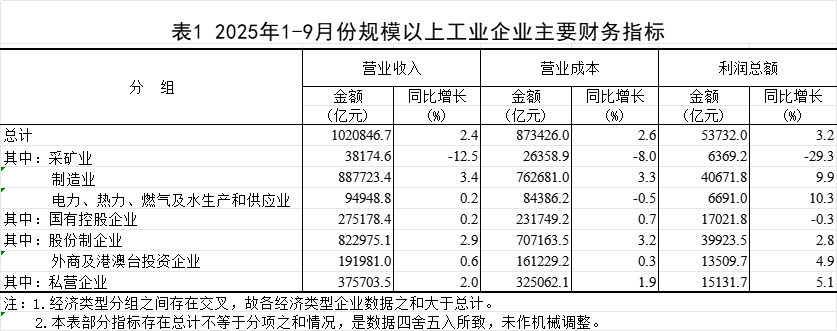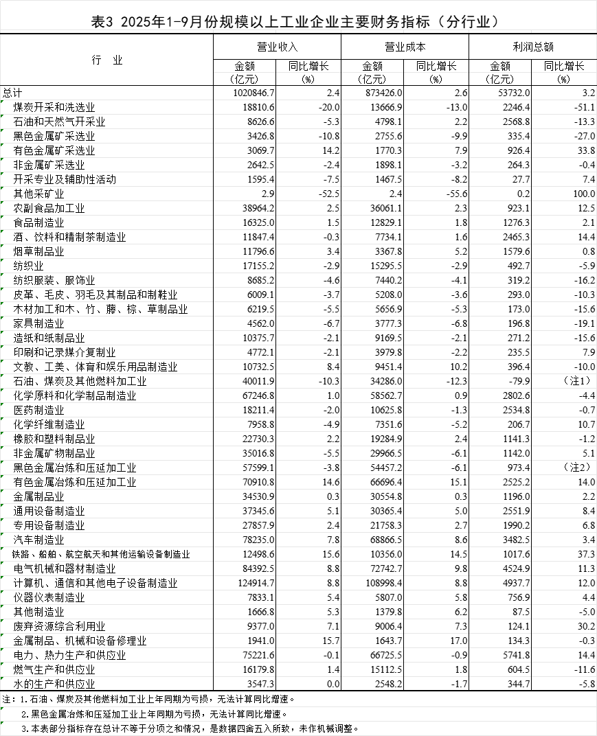 1—9月份,全国规模以上工业企业实现利润总额53732.0亿元,同比增长3.2%(按可比口径计算,详见附注二)。