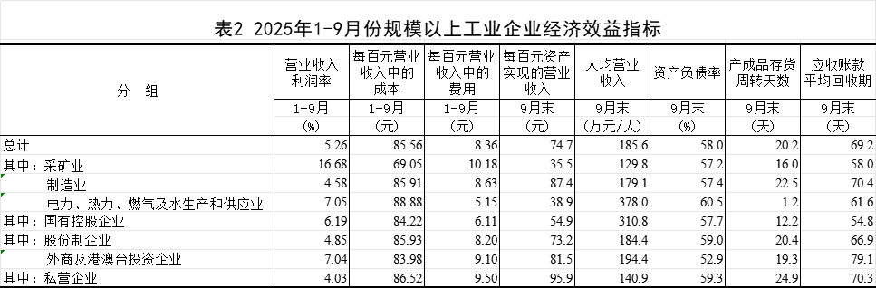 9月末,规模以上工业企业每百元资产实现的营业收入为74.7元,同比减少1.9元;人均营业收入为185.6万元,同比增加6.2万元;产成品存货周转天数为20.2天,同比增加0.2天;应收账款平均回收期为69.2天,同比增加3.3天。