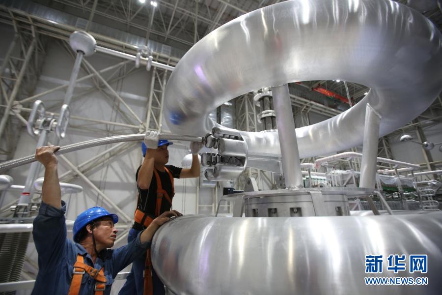 工作人员在乌东德电站送电广东广西特高压多端柔性直流示范工程广东受端龙门换流站安装设备(9月25日摄)。 新华社发(李品 摄)