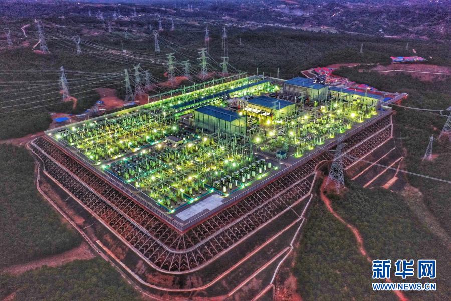 乌东德电站送电广东广西特高压多端柔性直流示范工程云南送端昆北换流站进行灯光测试(无人机照片,6月9日摄) 新华社发(李志杰 摄)