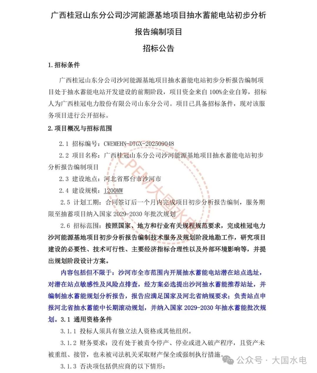 近日,大唐集团发布《广西桂冠山东分公司沙河能源基地项目抽水蓄能电站初步分析报告编制项目招标公告》,招标人为广西桂冠电力股份有限公司山东分公司,建设地点:河北省邢台市沙河市,建设规模:1200MW。