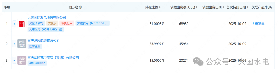 CPEM大国水电获悉中国大唐于重庆成立一家抽水蓄能公司:大唐银盘(重庆)抽水蓄能有限公司,法人周能奇。大唐银盘(重庆)抽水蓄能有限公司成立于2025年10月9日,注册地位于重庆市武隆区江口镇银盘路1号,注册资本135160万人民币,法定代表人为周能奇。由中国大唐集团旗下大唐国际发电股份有限公司、重庆发展能源有限公司、重庆武隆城市发展(集团)有限公司共同持股。