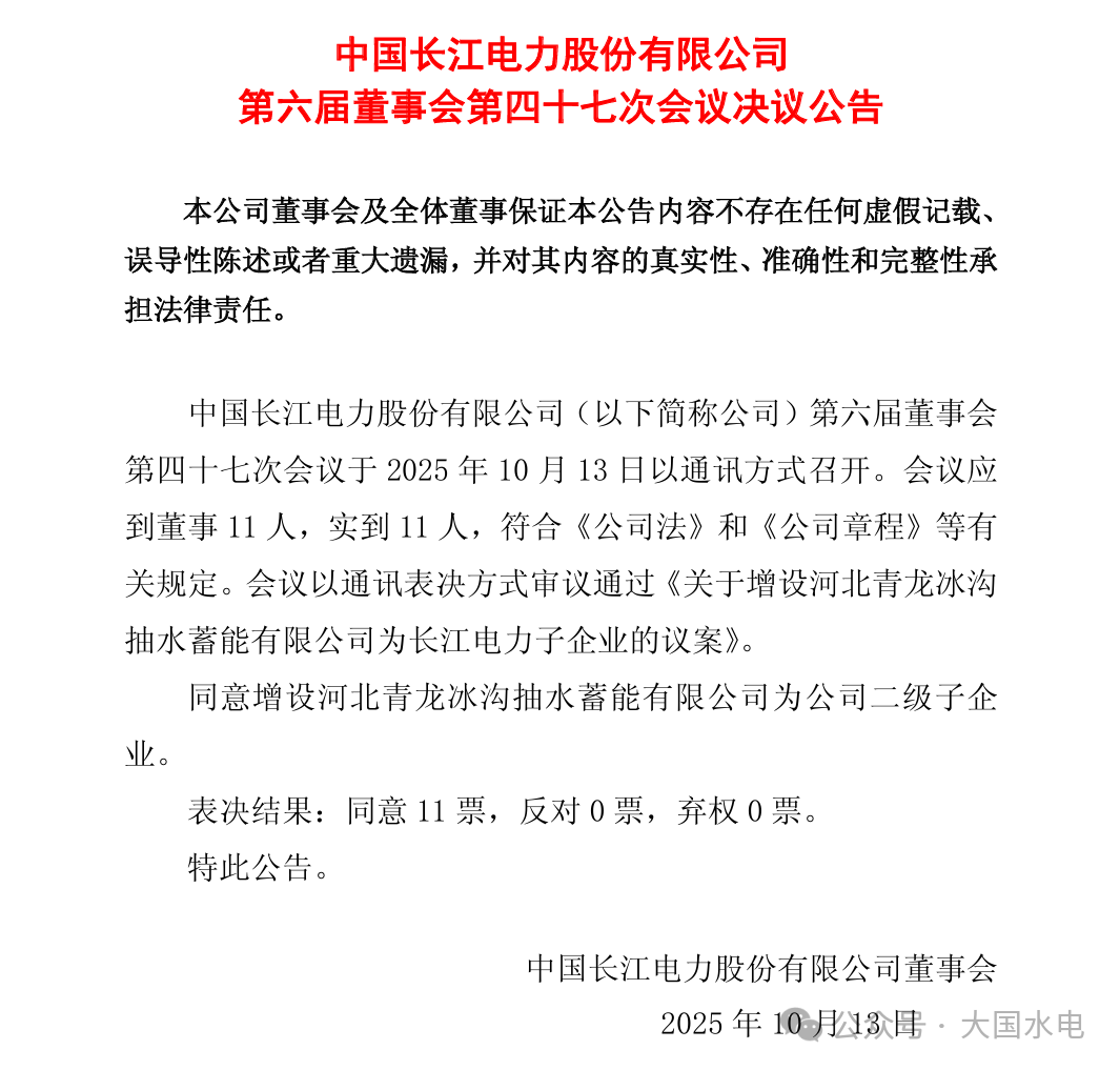 2025年10月:长江电力董事会审议通过增设“河北青龙冰沟抽水蓄能有限公司”为二级子企业,强化项目法人责任,推动项目落地。