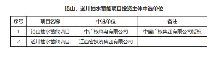日前,江西省能源局发布关于铅山、遂川抽水蓄能项目投资主体中选单位的公示,中广核风电有限公司、江西省投资集团有限公司分别中标2个项目,详情如下: