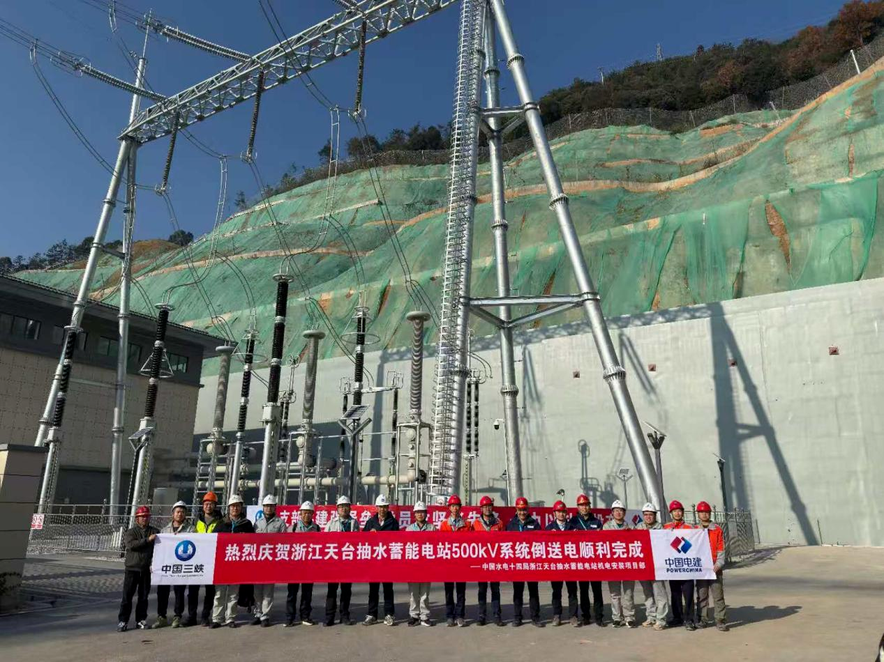 天台抽蓄电站地面GIS采用二分之三接线,主要有4组进线、2组出线,通过两回500千伏线路接入浙江500千伏回浦变电站。在倒送电过程中,三峡建工所属天台抽蓄公司精心组织、各试验单位密切配合,经过59小时连续作战,全面通过新设备充电、核相及相关保护校验、投切线路试验、线路合解环及保护复校等试验,并顺利完成24小时试运行。