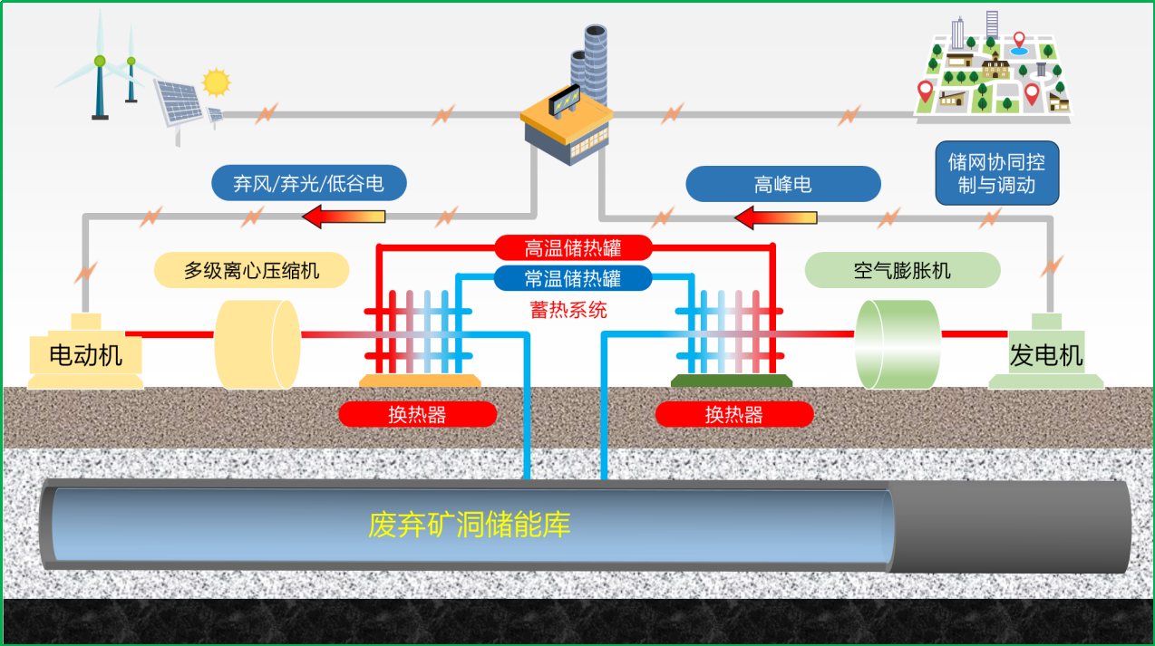 储能环节:压缩空气储能系统在用电低谷或电力过剩时,利用风电/光电或电网负荷低谷期的电能带动压缩机,将电能转化为空气压力能,随后高压空气被密封存储于报废矿井(电能→势能);