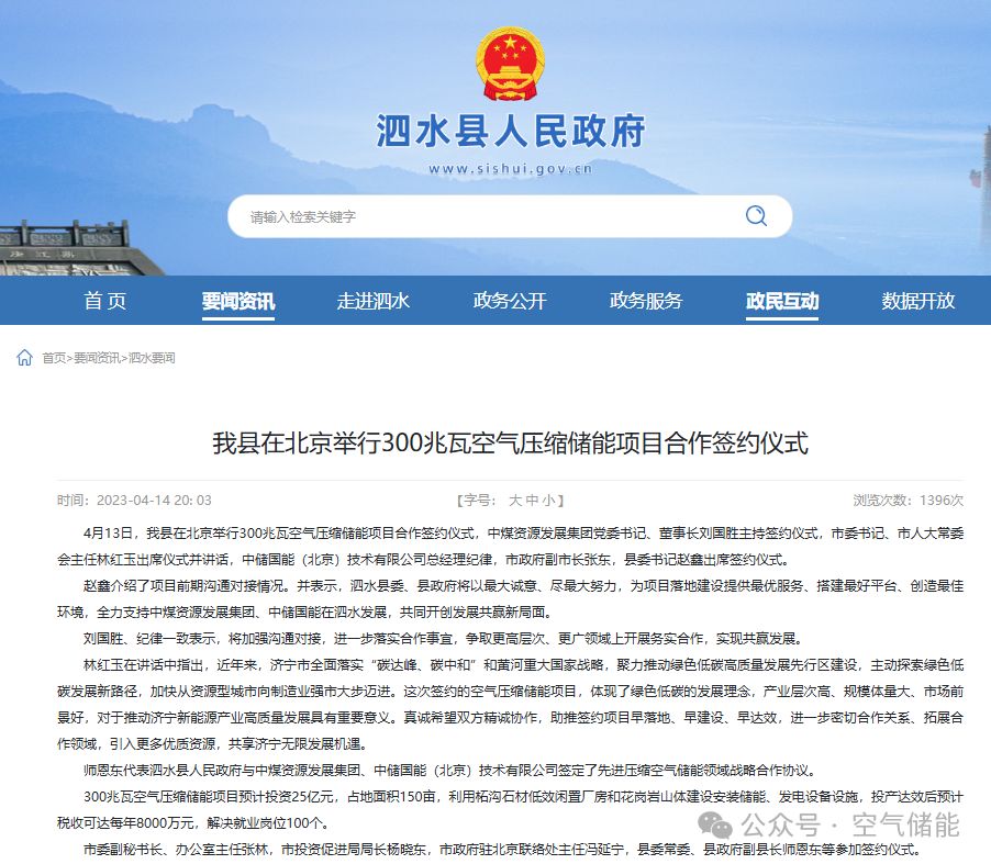 山东省济宁市泗水县300MW/1200MWh先进压缩空气储能项目由中储国能(北京)技术有限公司联合美锦能源集团有限公司等企业共同投资建设。总投资额约20亿元。占地面积约120-150亩,利用柘沟镇石材产业低效闲置厂房及花岗岩山体资源建设。