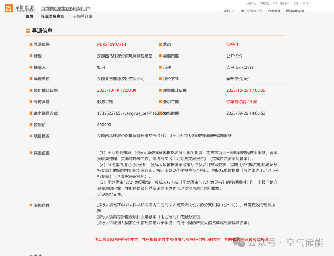 近日,深圳能源发布“深能西乌珠穆旗3×350MW/4200MWh压缩空气储能项目土地预审及勘测定界报告编制服务”招标。