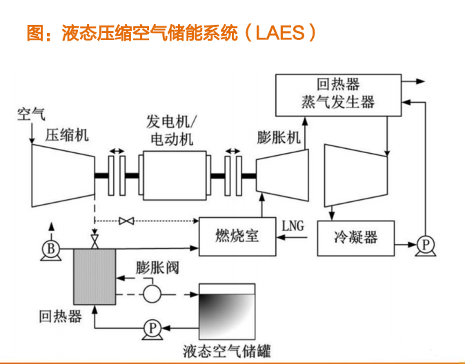 液态压缩空气储能系统(LAES):借助于空气降温液化技术,通过添加流程使空气以液态形式储存。储能时,经过压缩机的高压空气进入回热器降温和降压设备进行液化,被液化的常压低温液态空气储存在储液罐中;释能时,液态空气经过低温泵升压、回热器升温,然后进入燃烧室,与燃料混合燃烧后进入膨胀机膨胀做功。
