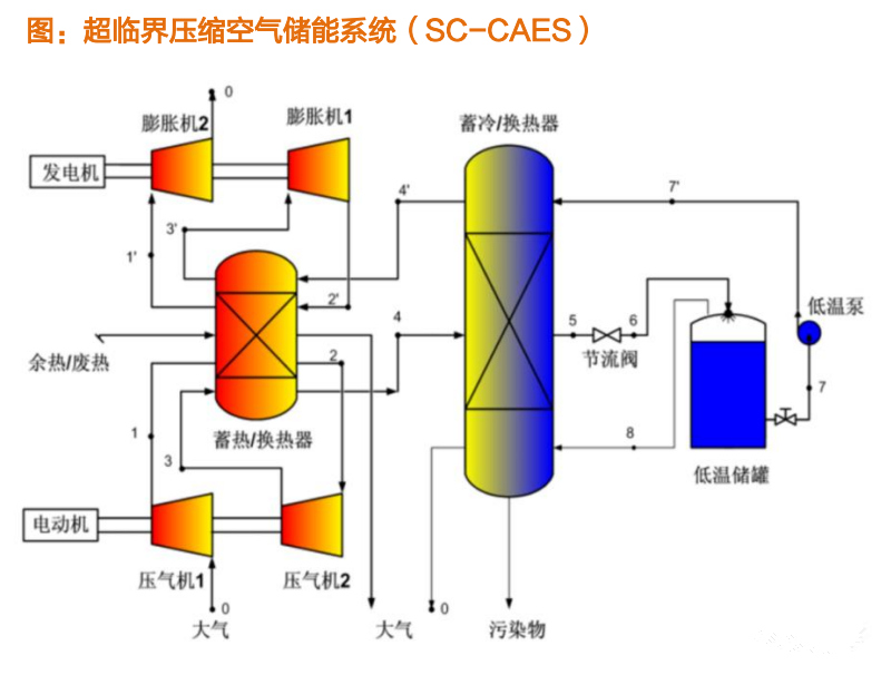 超临界压缩空气储能系统(SC-CAES):利用空气的超临界特性,在蓄热/冷过程中高效传热/冷,并将空气以液态形式储存,实现系统高效和高能量密度的优点,系统兼具蓄热式和液态压缩空气储能的特点,同时摆脱了依赖大型储气室和化石燃料的问题。