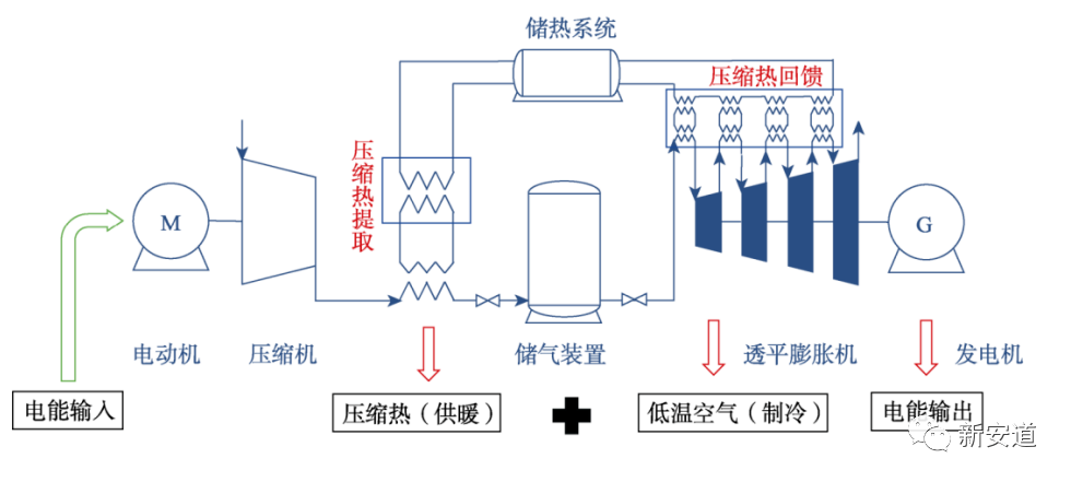 蓄热式压缩空气储能(TS-CAES):空气压缩过程会产生压缩热,在传统压缩空气储能中,这部分热量通常被冷却水带走,最终耗散掉,而蓄热式压缩空气储能则将这部分热量在储能时储存起来,而在释能时用这部分热量加热膨胀机入口空气,实现能量的回收利用,提高了系统效率。同时由于膨胀机前有压缩热的加热,可以取消燃烧室,即该系统也摆脱了对化石燃料的依赖。