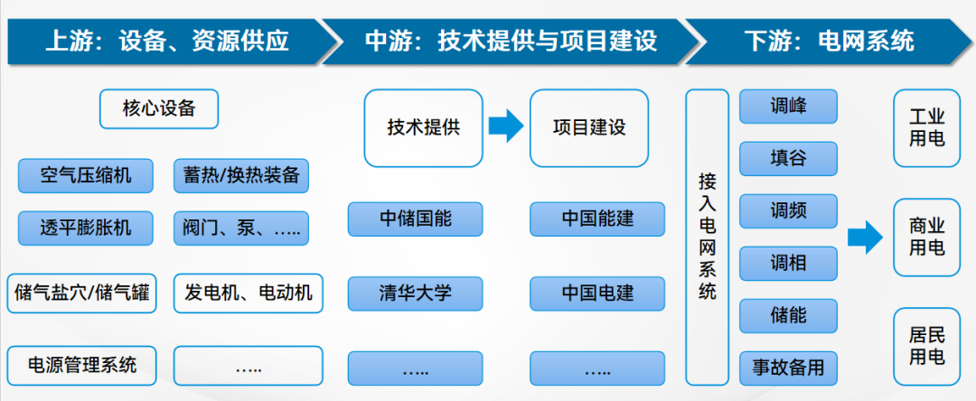 上游——设备、资源供应:核心设备包括空气压缩机、透平膨胀机、蓄热换热系统等,此外还需要储气盐穴资源等。