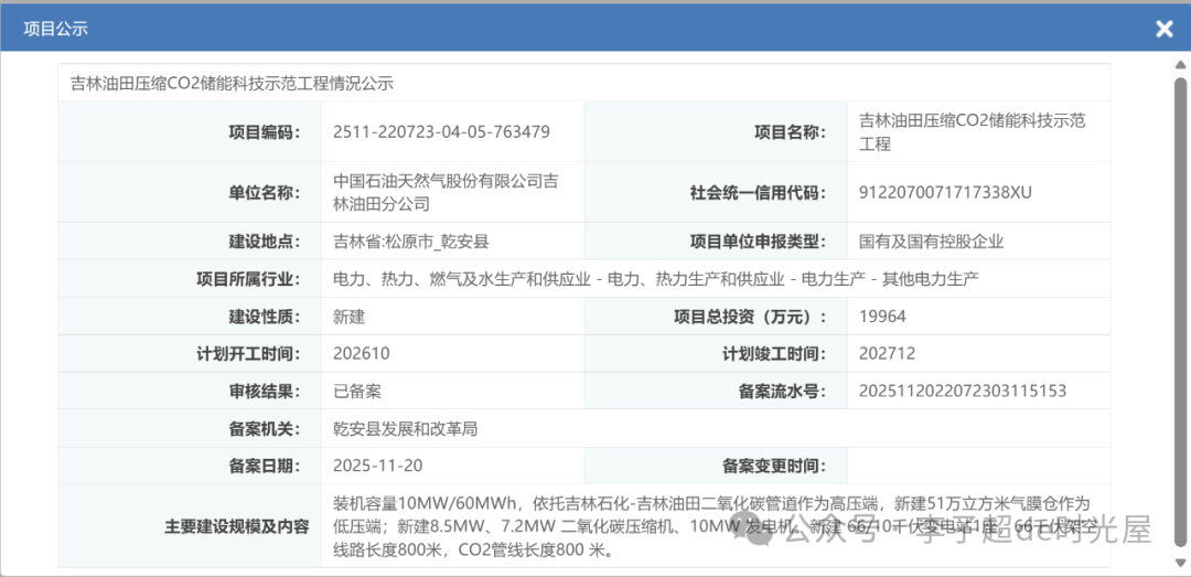 11月20日,据吉林投资监管平台披露:吉林油田压缩CO2储能科技示范工程申请备案乾安县发展和改革局2025-11-20审批通过项目代码:2511-220723-04-05-763479项目规模:10MW/60MWh单位名称:中国石油天然气股份有限公司吉林油田分公司项目总投资:19964万元
