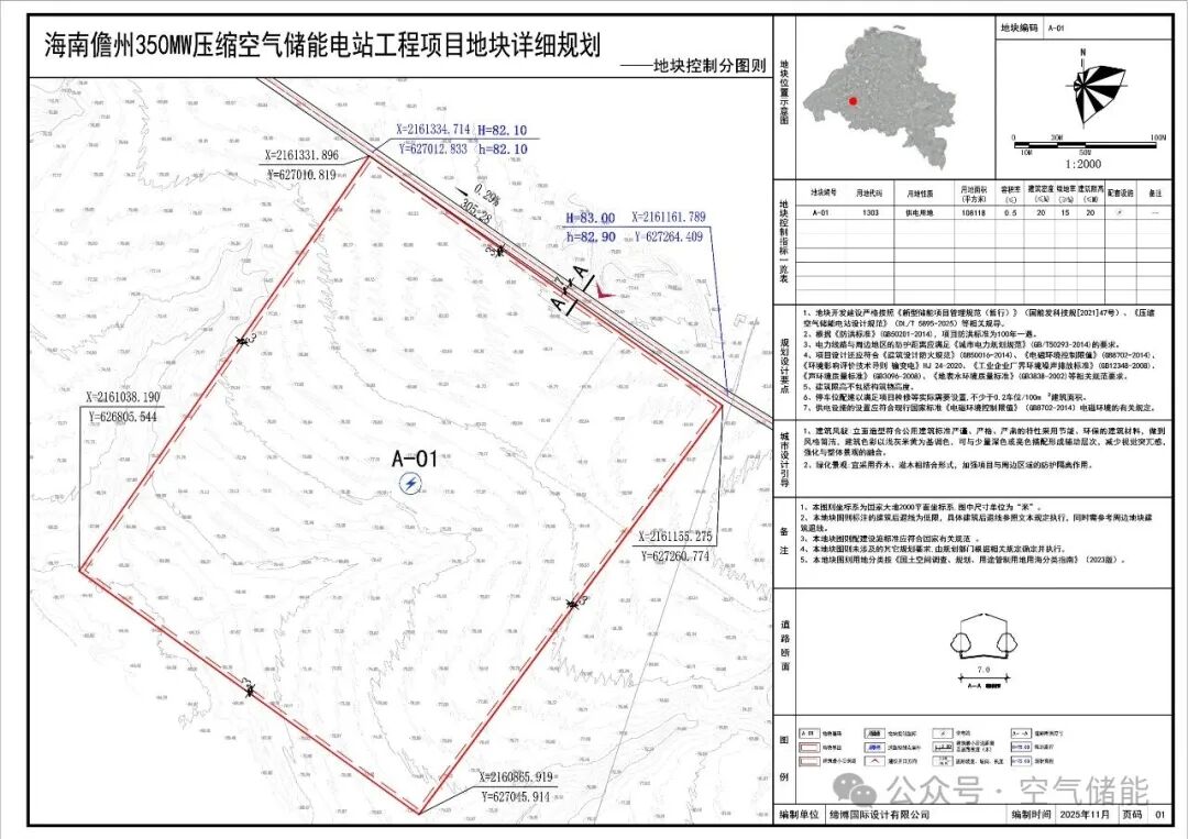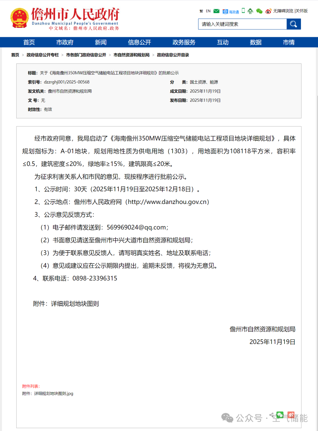11月19日,儋州市人民政府网站发布关于《海南儋州350MW压缩空气储能电站工程项目地块详细规划》的批前公示,详情如下: