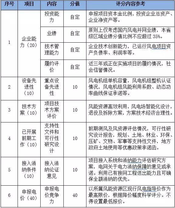 各省级能源主管部门可参照表2自行制定竞争配置评分细则,但不应设置或变相设置有违市场公平的条款。原则上采取综合评分法,其中电价权重不得低于40%。