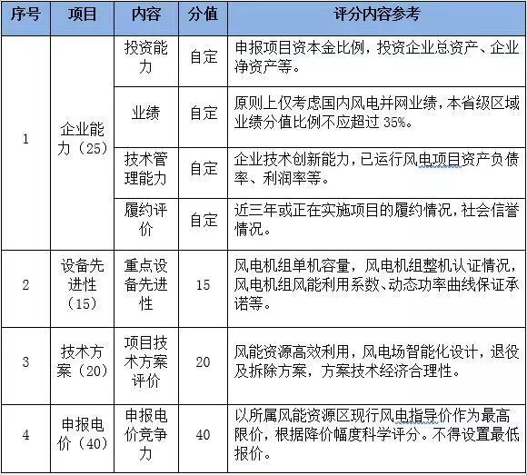 各省级能源主管部门可参照表1自行制定竞争配置评分细则,但不应设置或变相设置有违市场公平的条款。可采取综合评分法,其中电价权重不得低于40%。也可采取先技术评选,再电价比选的方式,按电价由低到高排序分配完为止。