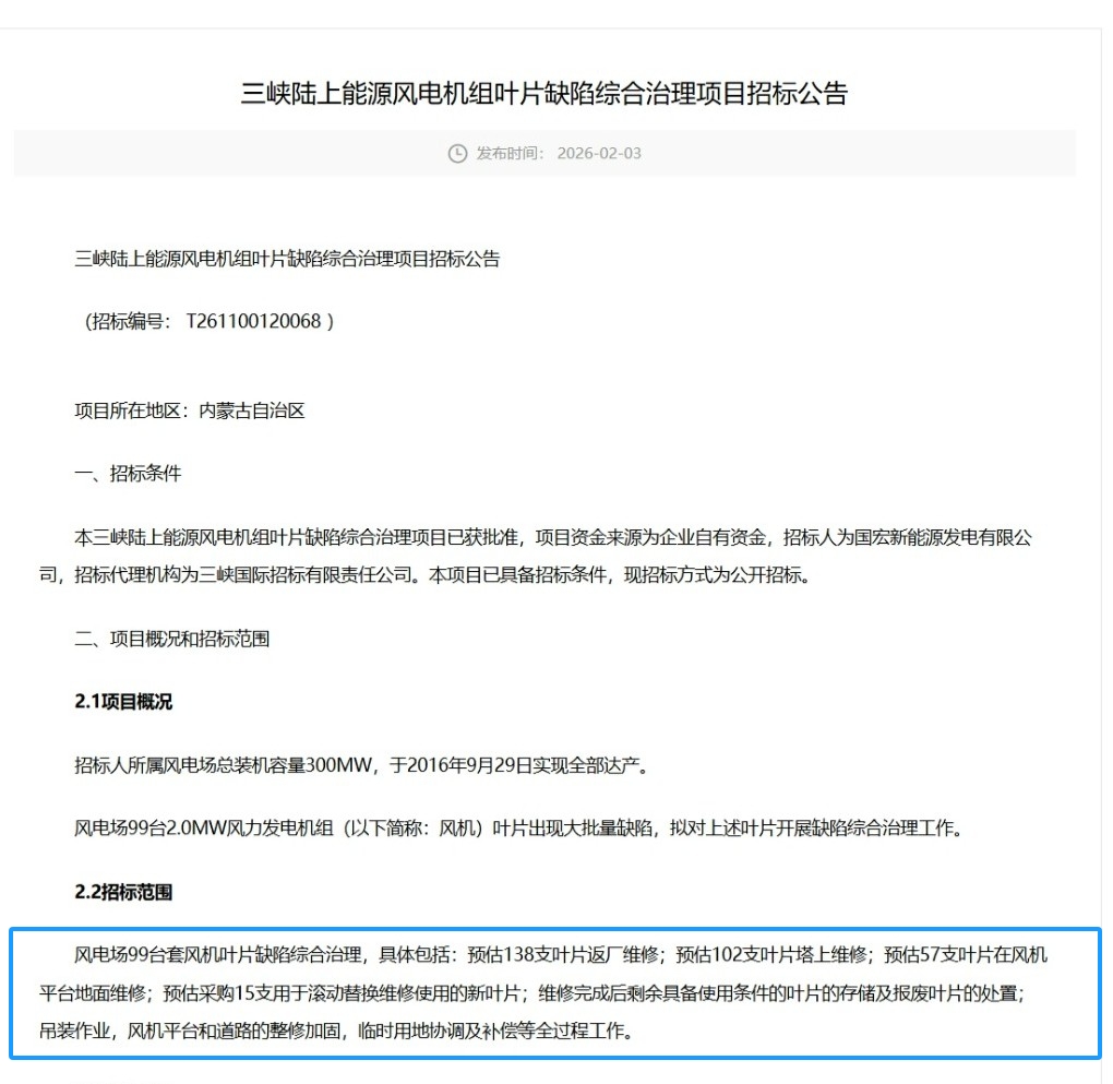 2026年2月3日,三峡发布《三峡陆上能源风电机组叶片缺陷综合治理项目招标公告》。