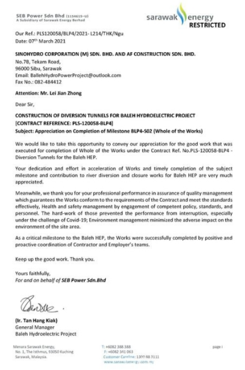 近日,中国水电(马来西亚)有限公司收到马来西亚巴莱水电站项目业主砂捞越能源公司(SEB)对项目4标段整体提前竣工的表扬函。