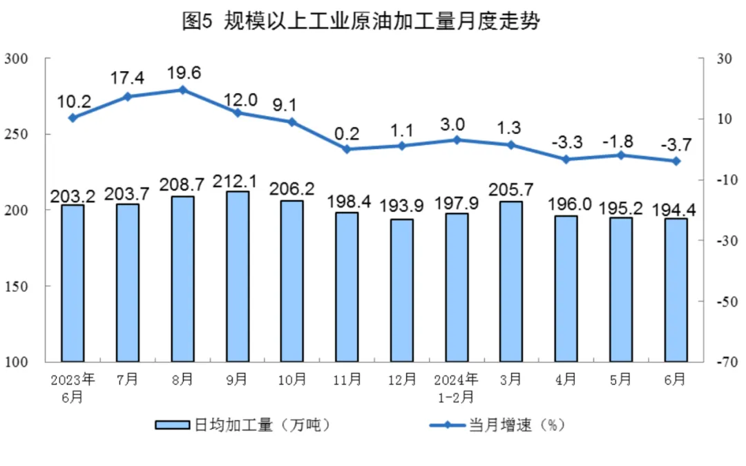 原油生产增速加快。6月份,规上工业原油产量1795万吨,同比增长2.4%,增速比5月份加快1.8个百分点;日均产量59.8万吨。进口原油4645万吨,同比下降10.7%。