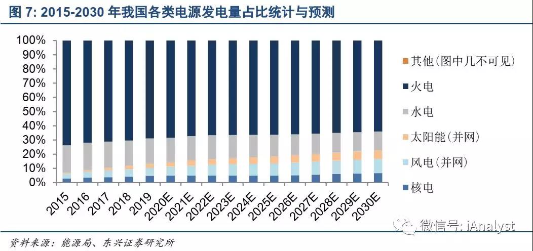为满足用电量增长、抑制平均能耗上升的需求,发电装机亦将持续增长,且清洁能源占比将进一步提高。我们预计,2020年底、2025年底、2030年底,中国大陆各类电源装机总容量将分别达到2,124GW、2,566GW、2,930GW,火电装机占比分别降至57.6%、52.0%、47.3%,如图6所示。