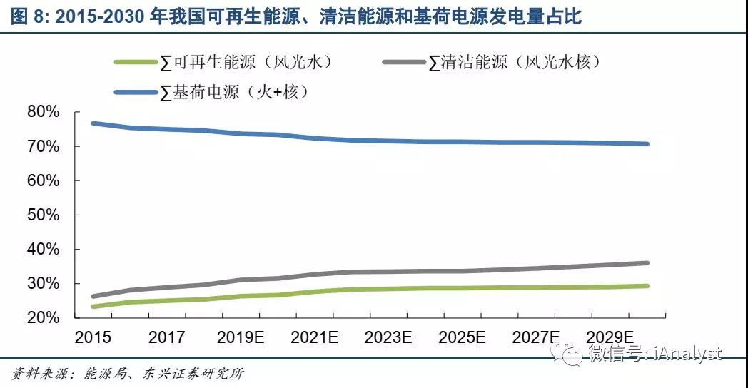 我们同时预计,2020年、2025年、2030年,火电对于发电量的贡献,将分别降至68.4%、66.3%、64.0%,如图7所示;可再生能源(风、光、水)发电量占比分别为26.7%、28.7%、29.3%,基荷电源(火电+核电)发电量占比分别为73.3%、71.3%、70.7%;清洁能源(风、光、水、核)发电量占比分别为31.6%、33.7%、36.0%。可见,电力消费结构在保证必要的基荷电源占比前提下实现一定的优化,如图8所示。