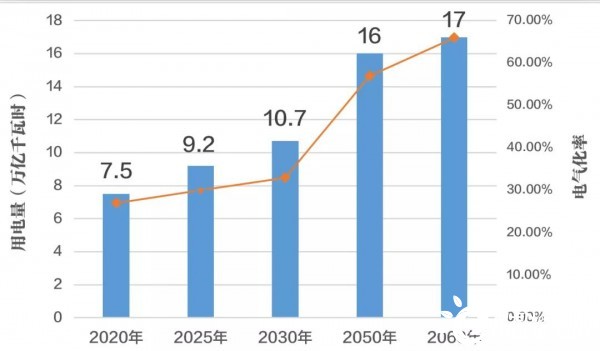 能源消费环节加快电能替代、提升电气化率十分必要。从中长期来看,中国经济仍将保持长期稳定增长,终端能源需求仍有增长空间。电能具有清洁、高效、安全、便捷等优势,是利用效率最高、经济效率最高的终端能源品种。随着工业、交通、建筑等领域电能替代推进,电能在全社会终端能源消费占比将从目前的27%提升至66%,这将带动电力需求快速增长,达到14-15万亿千瓦时。