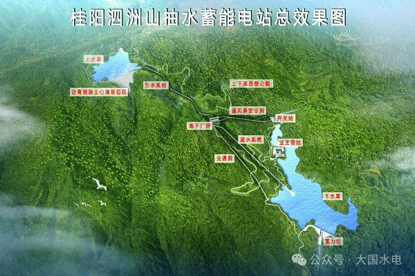 桂阳泗洲山抽水蓄能电站(亦称湖南桂阳泗洲山抽水蓄能电站)是《抽水蓄能中长期发展规划(2021-2035年)》"十四五"重点实施项目,总投资约80.8亿元,装机容量120万千瓦,位于湖南省郴州市桂阳县桥市乡境内,下水库部分区域涉及衡阳市常宁市白沙镇。项目由华电国际电力股份有限公司湖南分公司(中国华电集团)负责开发建设,是湘南地区规划的重要清洁能源基础设施项目。